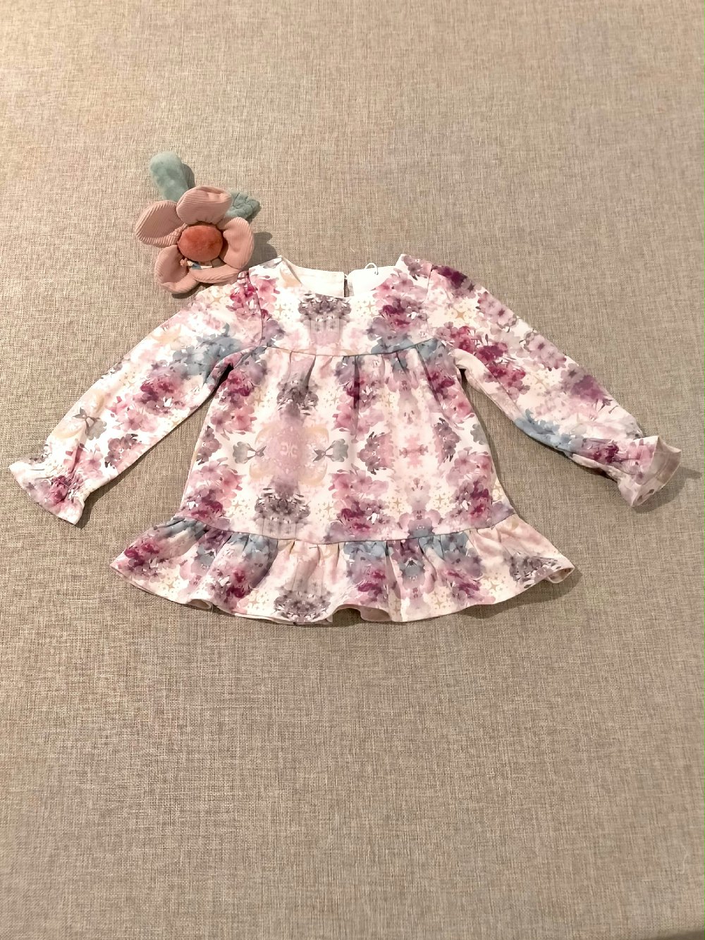 Un abito dolcissimo per la tua bimba! Con fantasia floreale all over, fondo manica arricciato e una graziosa balza al fondo, è perfetto per ogni occasione. L’allacciatura con bottoncino sul retro lo rende pratico e comodo da indossare.