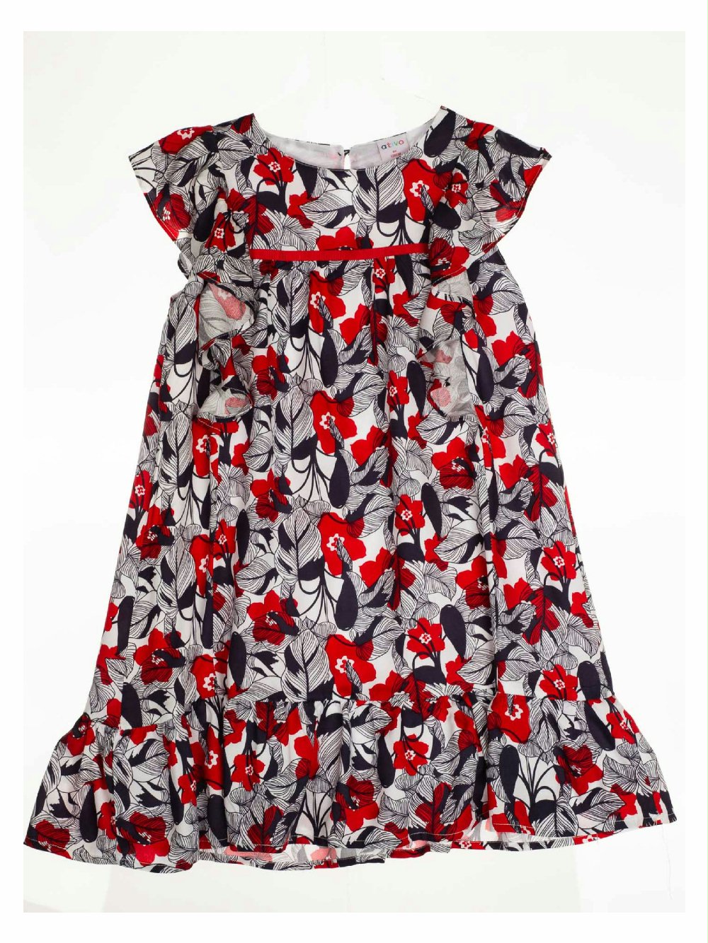 Abito smanicato – 100% viscosa fantasia all over foderato in cotone – con volant al giromanica e balza al fondo. Allacciatura posteriore con bottoncino.