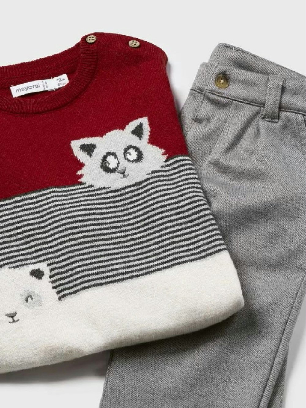 Questo completo Mayoral unisce eleganza e comfort: maglioncino color-block con bottoncini sulla spalla e grazioso intarsio, pantaloni in panno con taschine e vita elasticizzata con elastico regolabile e passanti. Pensato per le occasioni speciali con stile e comodità!