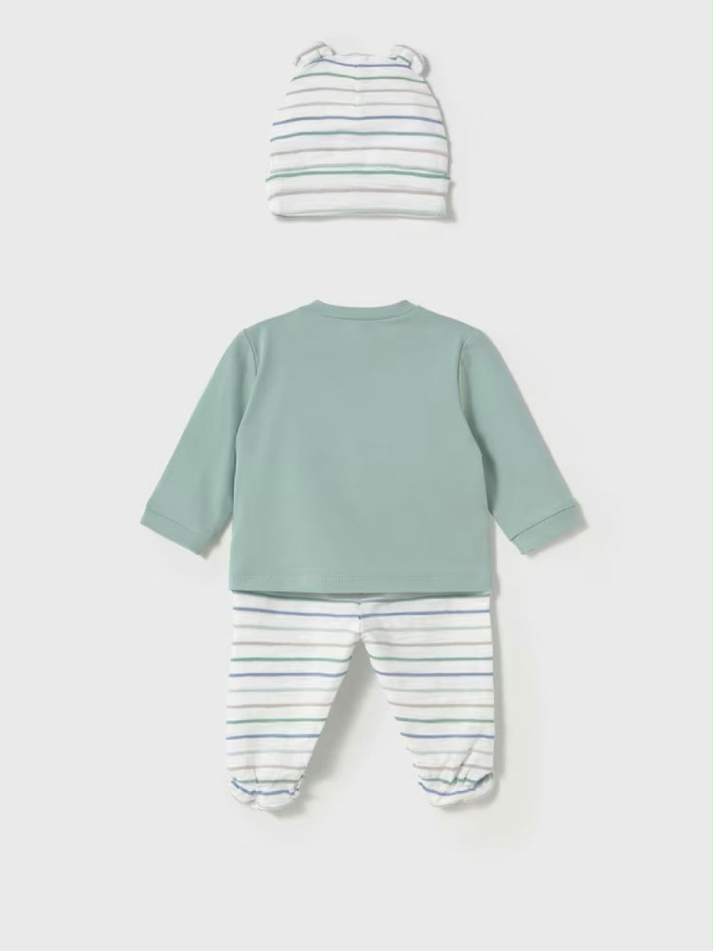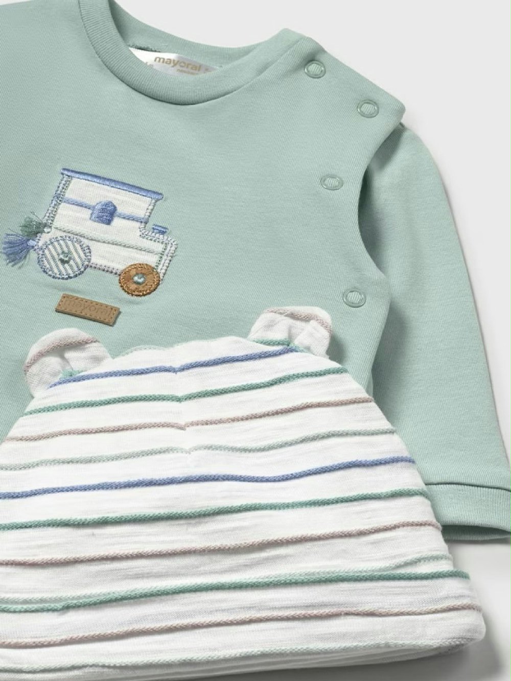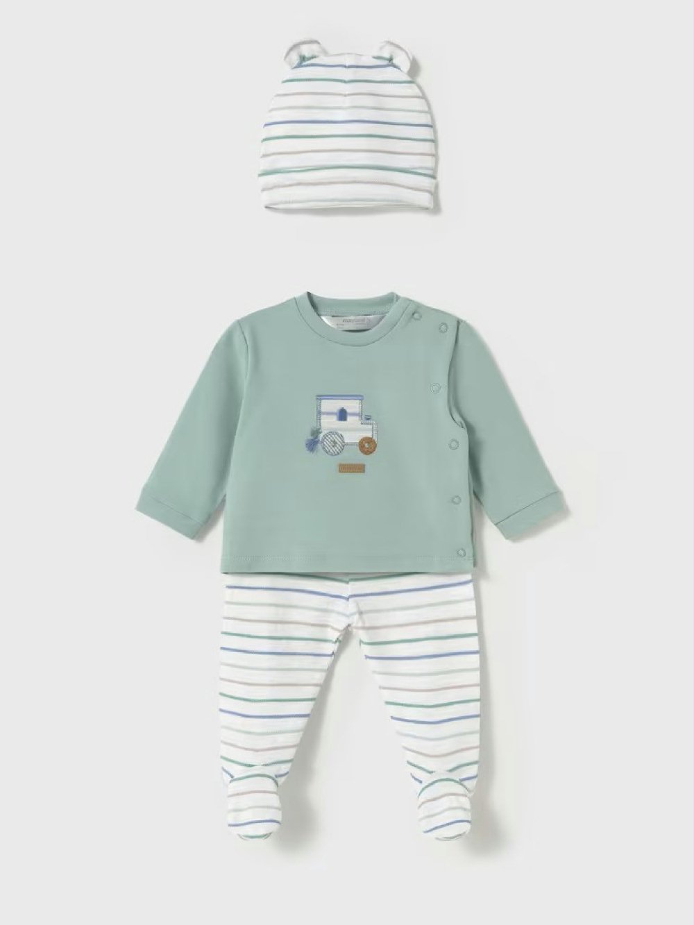 Ogni mamma merita la tranquillità di sapere che il suo bimbo è sempre comodo e protetto! Questo completo di Mayoral New Born in morbido cotone è perfetto per la pelle delicata de neonati. La t-shirt ricamata a manica lunga – con apertura a kimono tramite comodi bottoncini a pressione, rende il cambio facile, la ghettina rigata avvolge con dolcezza e il cappellino con orecchie completa il look con un tocco tenerissimo. Perfetto per le prime avventure del tuo piccolo!