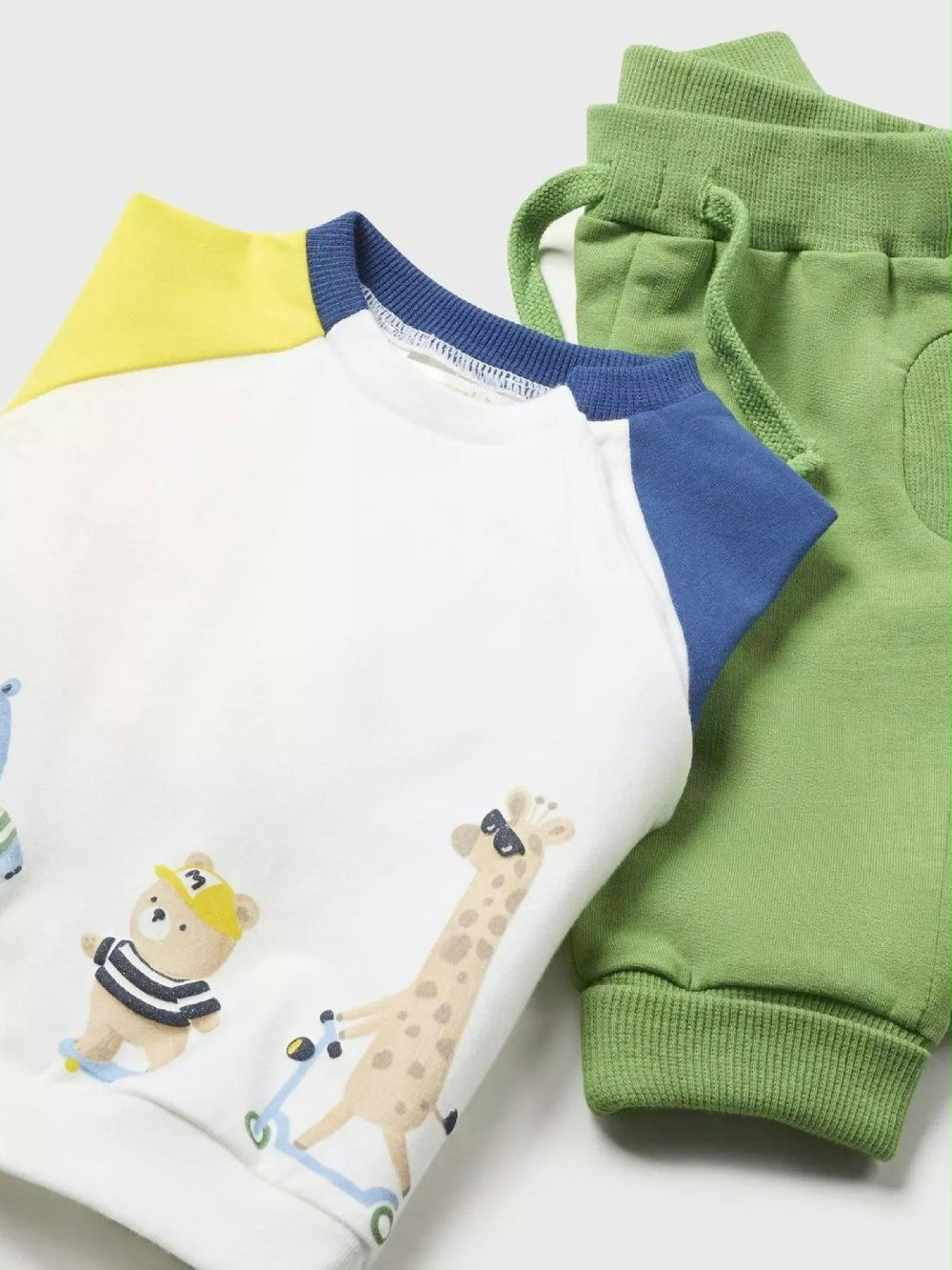 Il completo per neonato di Mayoral New Born è perfetto per il comfort quotidiano. Composto da una t.shirt a manica lunga in cotone stretch con pratici automatici a pressione sulla spalla e da un pantalone in felpa con elastico in vita e finte tasche decorative. Morbido, pratico e dallo stile allegro, è ideale per ogni giorno.