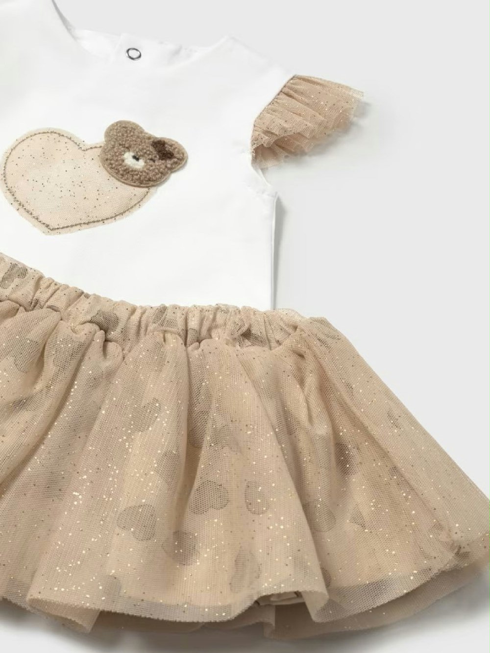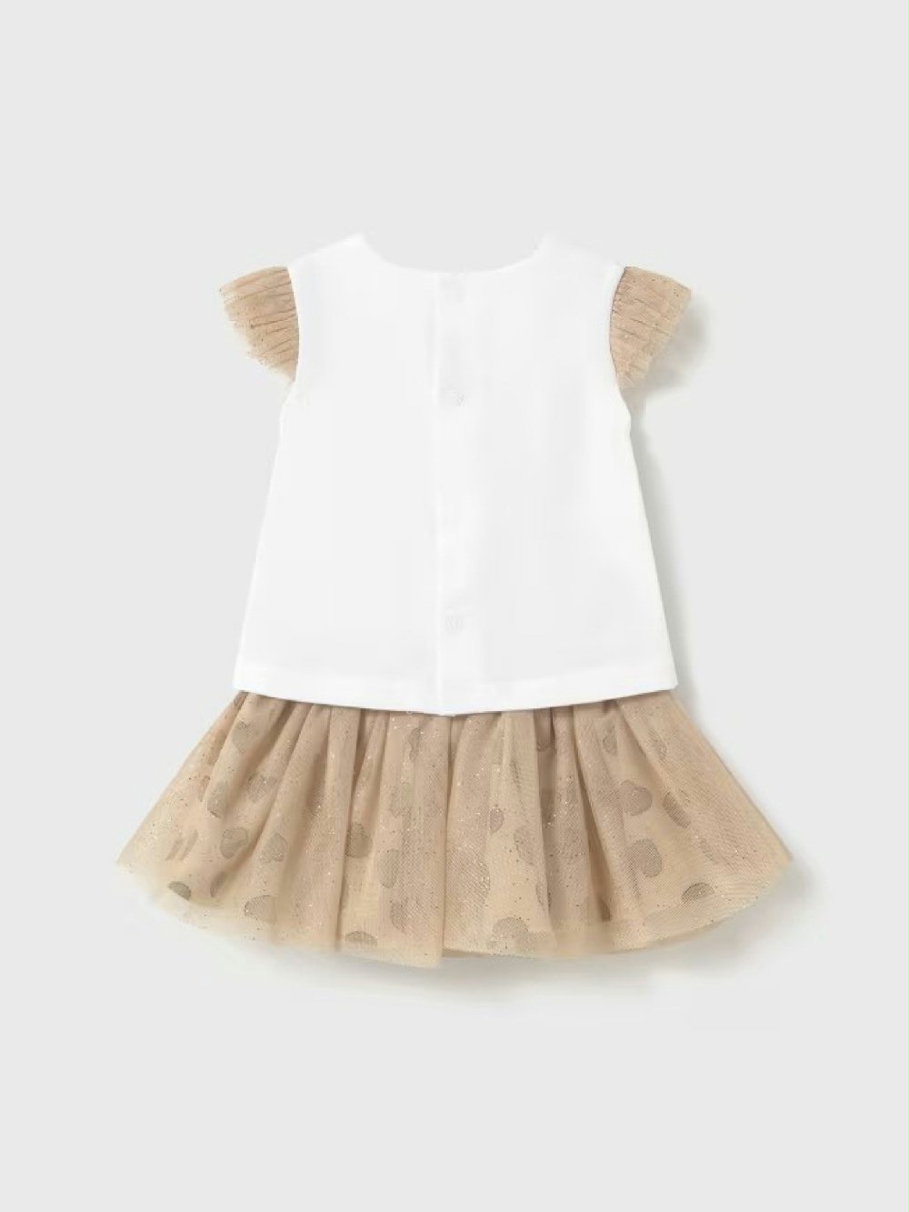 Fai brillare la tua piccola con questo adorabile completo di Mayoral Newborn! La t-shirt in cotone a manica corta con decoro, maniche in tulle e comoda apertura dietro con bottoncini, si abbina perfettamente alla gonna in tulle fantasia cuori con vita elasticizzata. Un look da sogno, perfetto per le mamme che vogliono vestire la loro bimba con stile, dolcezza e un tocco di magia!