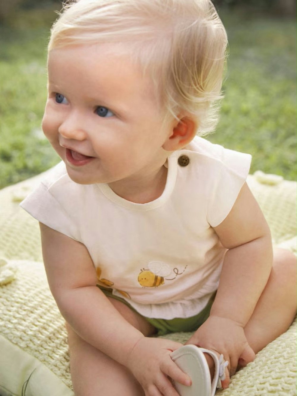 Lascia che ogni giornata inizi col sorriso! Questo completo di Mayoral Newborn è pensato per le mamme che vogliono praticità e stile: t-shirt a manica corta in cotone con volant al fondo e stampa dolcissima, abbinata a shorts con risvolto ed elastico in vita. Comodo, fresco e 100% adorabile!