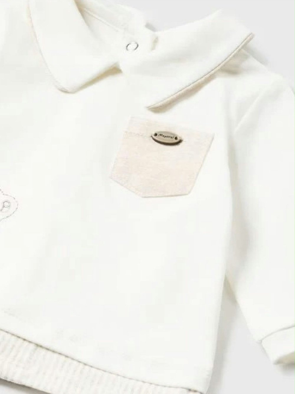 Il completo due pezzi per neonato di Mayoral New Born unisce comfort e raffinatezza. La maglia in jersey stretch ha un elegante colletto camicia, un grazioso taschino con ricamo e una pratica chiusura con bottoni a pressione sul retro. La ghettina con piedini e vita elasticizzata assicura massimo comfort. Perfetto per un look pratico e curato ogni giorno.