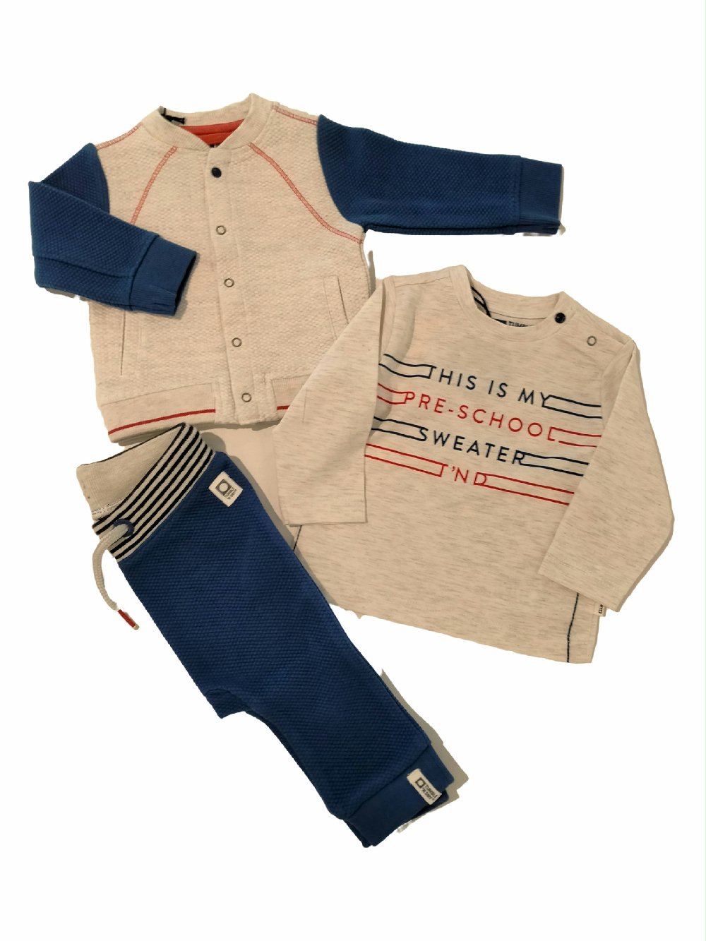 Completo tre pezzi: felpa girocollo con bottoni+t.shirt stampata a manica lunga +pantaloni con cintura elastica e coulisse – 100% cotone.