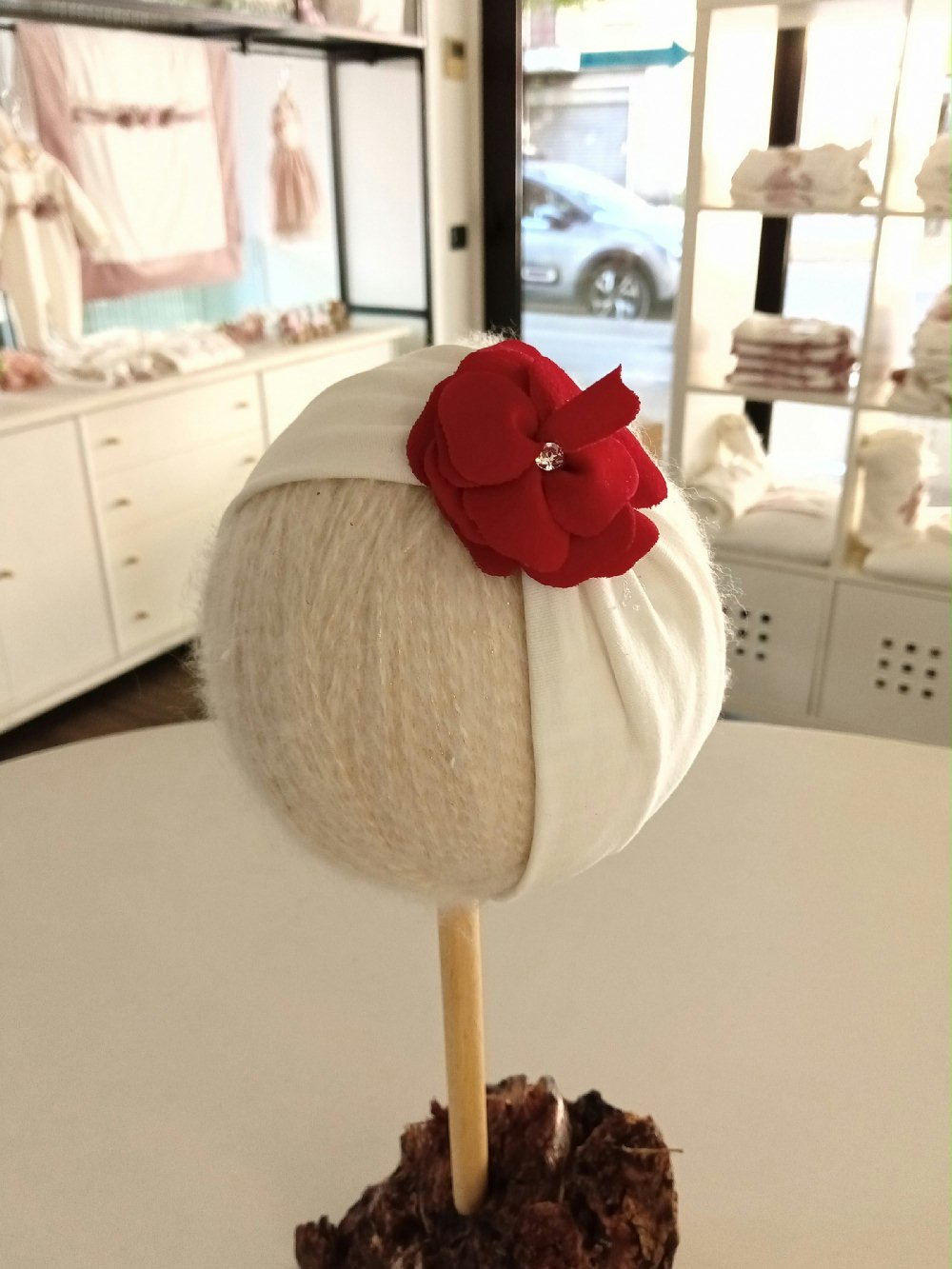 Fascetta in jersey stretch con decoro fiore in velluto con brillantino. Made in Italy