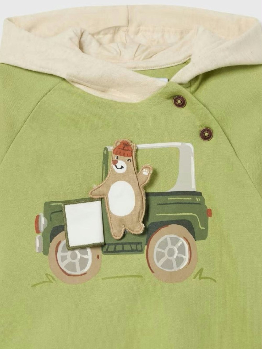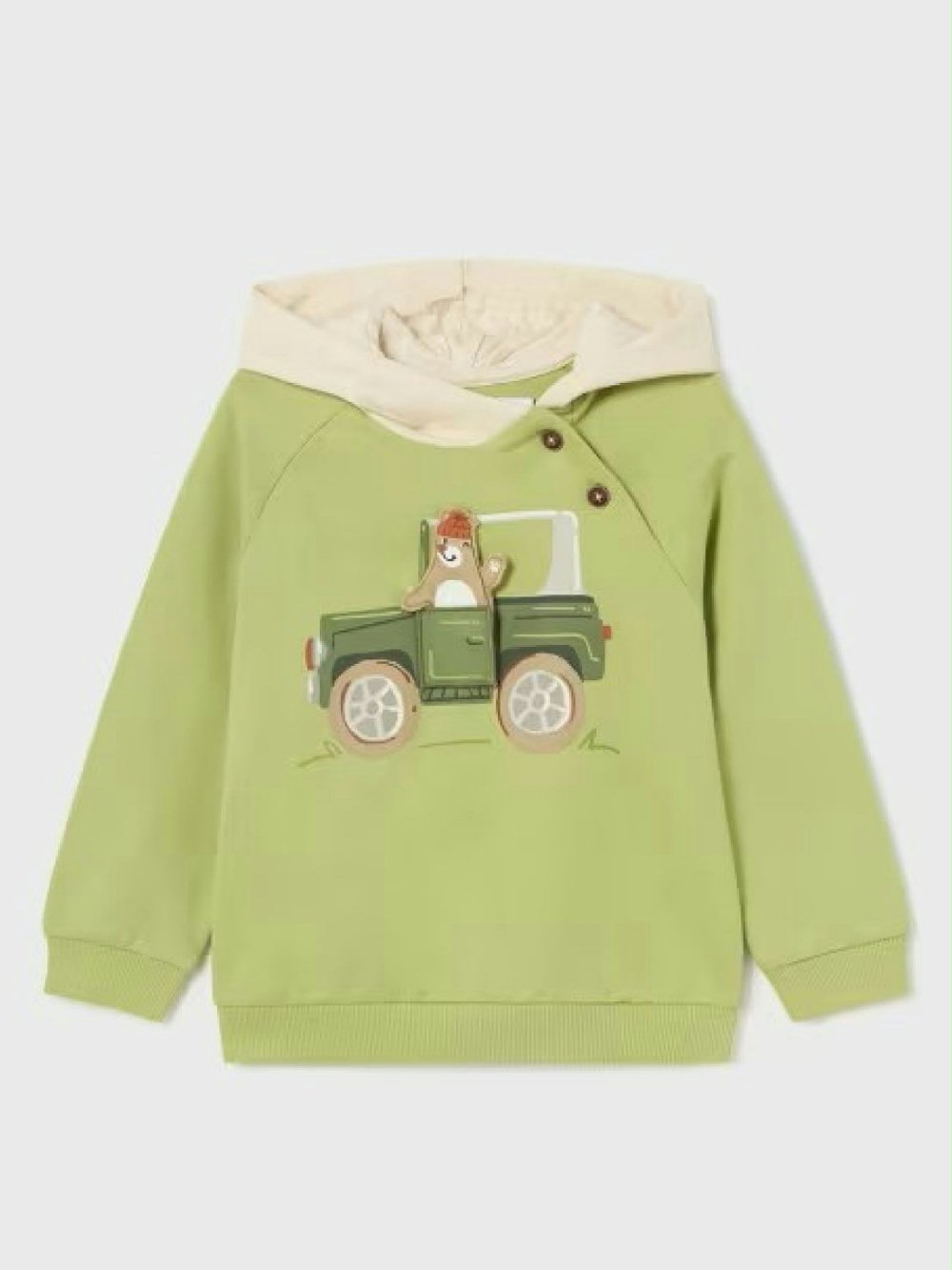 Felpa girocollo con cappuccio e stampa divertente, perfetta per le giornate di gioco. Realizzata da Mayoral, è comoda e colorata, con patch applicata per un look che farà sorridere ogni bimbo!