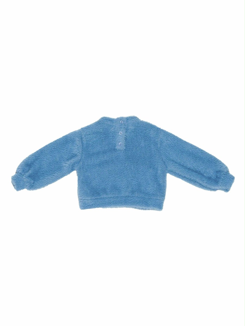 Morbida maglia girocollo arricchita dalla lavorazione del filato effetto fluffy, apertura dietro con due bottoncini. Graziose taschine applicate davanti. Made in Italy