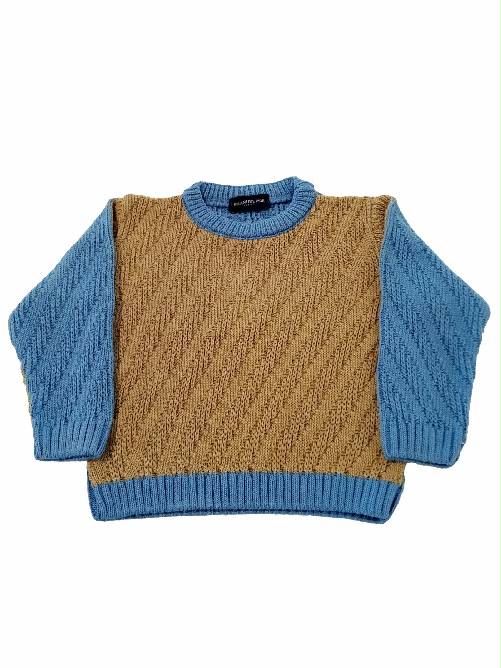 Maglia girocollo in lana color block, corpino beige, maniche collo e fondo color carta da zucchero. Made in Italy