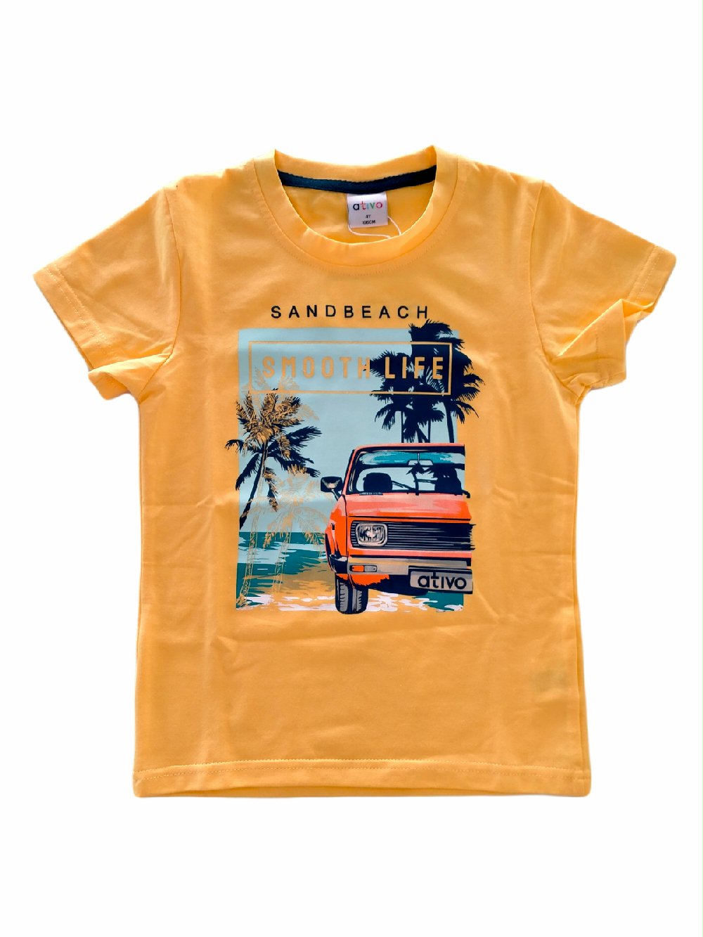 ATIVO KIDS – T.shirt in cotone a manica corta, stampa auto. Colori azzurro, bianco e giallo.