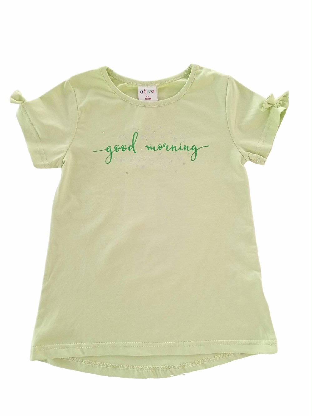 T.shirt per bambina in cotone stampa glitter, maniche corte con fiocchetto, retro con fondo stondato leggermente più lungo.