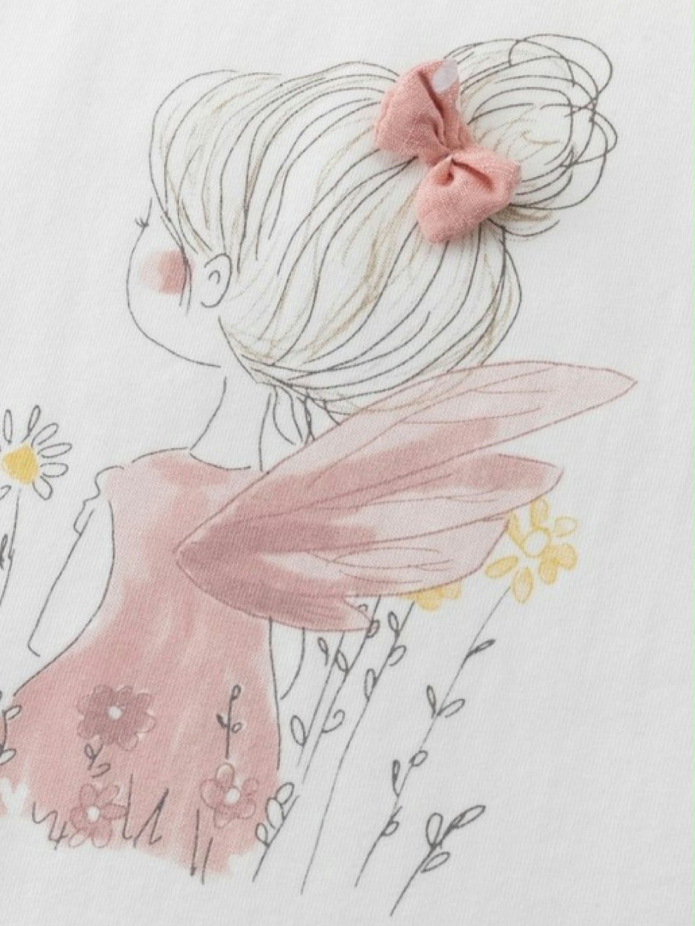 Una t-shirt che unisce comfort e stile con naturalezza. Il jersey stretch è morbido sulla pelle e accompagna ogni movimento, perfetto per le giornate piene tra scuola, giochi e tempo libero. La base bianca illumina il look, mentre la stampa con la piccola fatina e il fiocchetto applicato aggiungono un dettaglio originale. Facile da abbinare a gonne, jeans o leggings, è un capo di abbigliamento comodo, pratico e alla moda, pensato per farle sentire libere di muoversi e per far scegliere alle mamme uno stile fresco e curato.